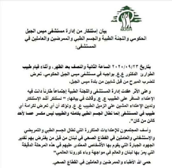 بتاريخ ۲۰۲۰/۰۹/۲۳ الساعة الثانية والنصف بعد الظهر، وأثناء قيام طبيب الطوارئ الدكتور ع. ع. بواجبه في مستشفی ميس الجيل الحكومي، تعرض للضرب المبرح من قبل شابين من بلدة ميس الجبل، وعلى الأثر عقدت إدارة المستشفى واللجنة الطبية إجتماعا طارئاً دانت فيه الإعتداء السافر على الطبيب ع. ع. وقالت في بيانها: " نستنكر أشد الإستنكار وندين الإعتداء المشين على الزميل الطبيب ع. ع. ونؤكد أن أي تعرض لكرامة أي طبيب في المستشفى إنما تطال الجسم الطبي بكامله والطبيب ليس مكسر عصا لأحد كائن من كان"