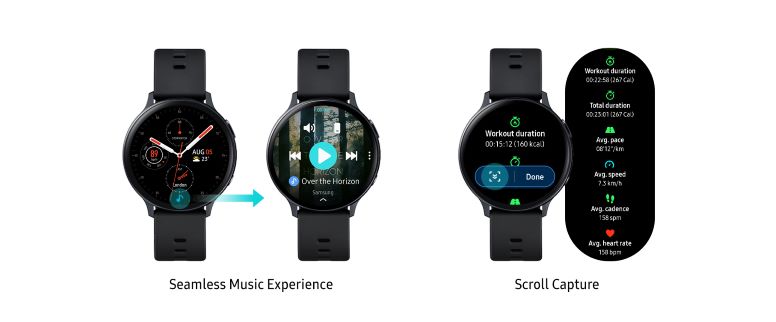 بالإضافة إلى ذلك، تدعم Galaxy Watch Active2 الآن ميزة التقاط الصور بالتمرير. لذلك عند التقاط صورة لشاشة ساعتك الذكية، يتم إرسالها تلقائياً إلى هاتفك الذكي. ما يمكنك من تسجيل المحادثات ومعلومات التمارين وحفظها بسرعة أكبر للرجوع إليها في المستقبل.