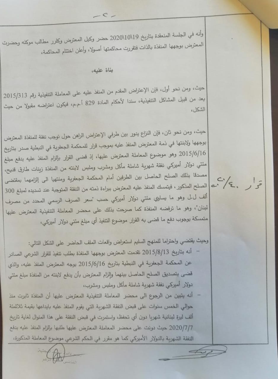 اصدر رئيس دائرة تنفيذ النبطية القاضي أحمد مزهر قرارا قضائيا بمثابة انتصار للمرأة