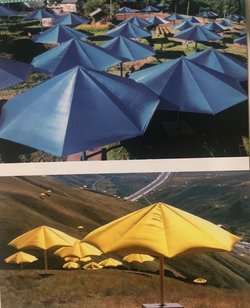 عندما أشرقت الشمس في 9 تشرين الأول (أكتوبر) عام 1991 على تلال شديدة الانحدار في «تيجان باس» على بعد 69 كلم شمالي لوس أنجلس، بدأت 1760 مظلة ضخمة، بارتفاع ستة أمتار وقطر طوله 8,66 أمتار، بالانفتاح كأزهار سريعة التكاثر، تغطي أرضاً بطول 29 كلم. قبل ساعات من الحدث، نرى الظاهرة نفسها تتكرّر مع 1340 مظلة زرقاء اللون على بعد 120 كلم شمالي طوكيو في اليابان بالقرب من نهر «ساتو» بامتداد 19 كلم. أما كيف استطاع كريستو المشاركة في الحدثين، فذلك يعود إلى استعمال الطائرة للتنقل بين المكانين.