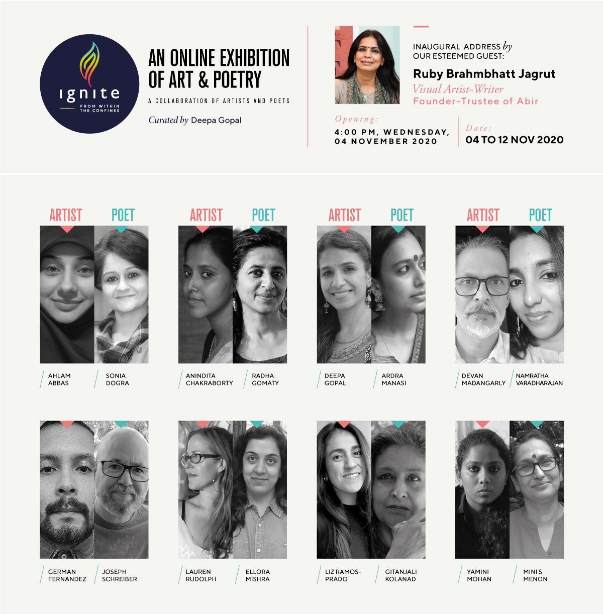نظمت المدوّنة والفنانة التشكيلية الهندية ديبا غوبال معرضا على الإنترنت بعنوان" IGNITE-from within the confines "،وضمّ ثمانية فنانين وثمانية شعراء وتخلل المعرض عرض مقاطع فيديو، ولوحات، وقصائد ومقاطع نصية تم بثها على وسائل التواصل الإجتماعي في الإنستغرام والفيسبوك واليوتيوب وفي حسابات خاصة،و تضمن المعرض 40 عمل فني و40 قصيدة شعريّة.