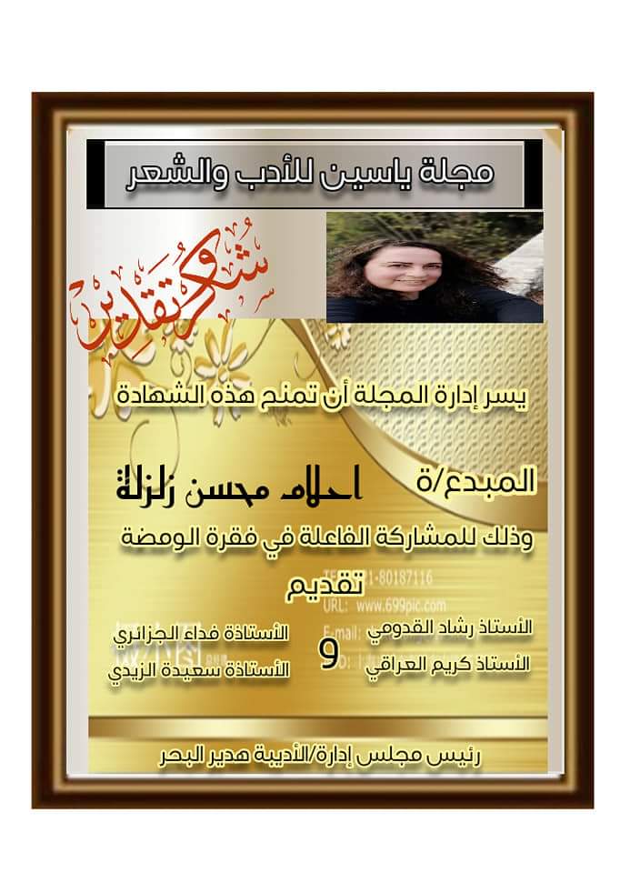 إبنة الخيام، الكاتبة والشاعرة الأستاذة أحلام محسن زلزلة، المبدعة في الشّعر والأدب، يكفينا فخراً أنها من هذا الجنوب المقاوم الأبيّ.