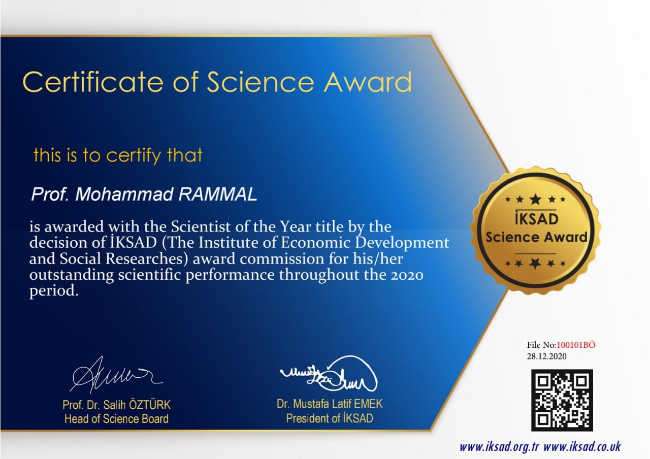 حصل الدكتور محمد رضا رمال ( عميد متقاعد من بلدة الدوير) على جائزة العلوم الفخرية من معهد التنمية الاقتصادية والبحوث الاجتماعية İKSAD (تركيا) وتم منحه شهادة تقدير على الأداء العلمي المتميز طوال عام 2020.