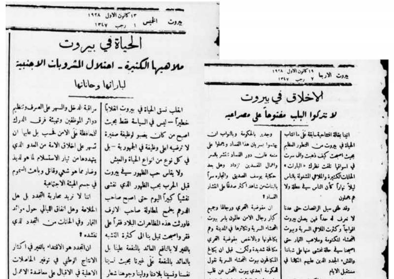 ناقش العديدُ من الأدباء والصحافيّين وضْعَ بيروتَ الجديد بعد وصول الفرنسيّين، متسائلين عن معنى ودور «العاصمة»، وعمّا يجعل بيروتَ مدينةً جذّابةً ومركزًا في المنطقة: ملاهيها وحياتها الليليّة، أم دُور نشْرِها وجامعاتها، وحفلاتها النوعية بين المثقّفين؟ تأسّف مثلاً محرّرُ جريدة «لسان الحال» عام ١٩٢٨ في افتتاحيّة مُعنْونة بـ«الحياة في بيروت، ملاهيها الكثيرة، احتلال المشروبات الأجنبيّة لباراتها وحاناتها»، على التغيير الجذريّ في أسلوب حياة المدينة بعد الحرب الكبرى و«احتلال» العادات الأجنبيّة17. الاحتلال بالنسبة له ليس فقط سياسيًّا، بل ثقافيٌّ أيضًا. واستنكر نزوعَ البيروتيّين إلى التباهي وتقليد الغرب وتَناسي الهويّة المحلّيّة، والركض خلف تيّار المدنيّة الحديث، وكتب: «إنّنا لا نريد محاربةَ التجدّد، بل هل الخلاعةُ وهل إنفاق الليالي حول موائد القمار وفي الحانات من التجدّد الذي ننشده؟».