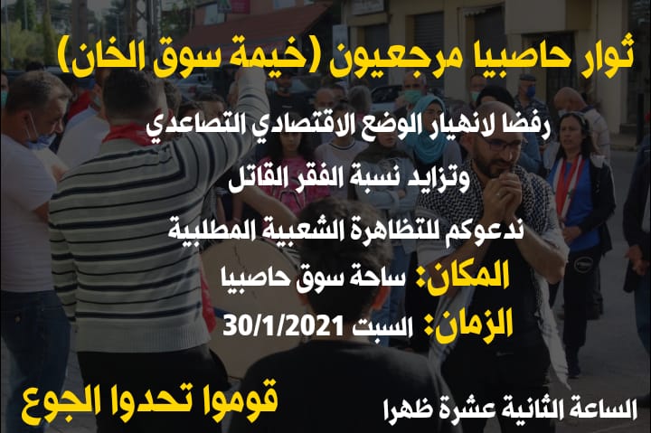 رفضاً لانهيار الوضع الاقتصادي التصاعدي، دعا ثوار حاصبيا مرجعيون (خيمة سوق الخان) إلى المشاركة في تظاهرة شعبية مطلبية في ساحة سوق حاصبيا.