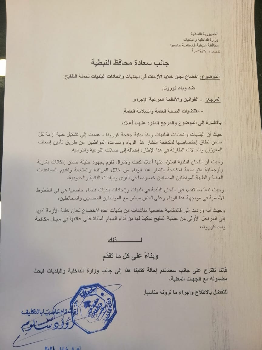 حيث ان البلديات واتحاد البلديات خصوصا في القرى والبلدات النائية ومنذ بداية جائحة كورونا عمدت الى تشكيل لجان طوارئ لمكافحة انتشار هذا الوباء عن طريق تامين اسعاف المعوزين والمصابين والحالات الطارئة في هذا الاطار فضلا عن تقديمها لعدد من المساعدات العينية والطبية وحيث تبعا لما تقدم فإن اللجان البلدية في بلديات واتحاد بلديات قضاء حاصبيا هي في الخطوط الامامية لمواجهة هذا الوباء وعليه فاننا نقترح على جانبكم البحث في مضمون كتابنا مع الجهات المعنية لجهة اخضاع اللجان المذكورة للمراحل الاولى من عملية التلقيح لكي تتمكن هذه اللجان من اداء المهام الجمة الملقاة على عاتقها في مجال مكافحة وباء كورونا