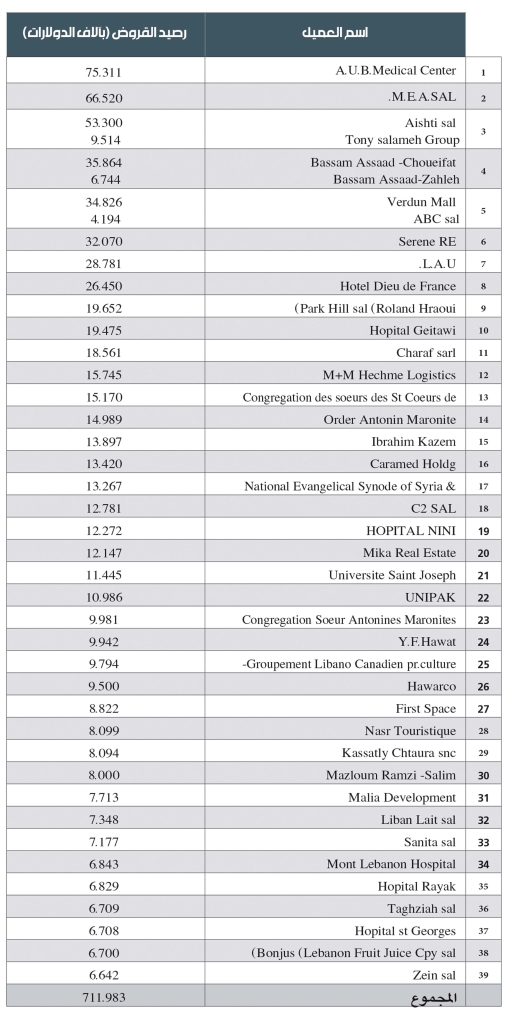 ومن بين هؤلاء، 39 زبوناً فقط حصلوا على 712 مليون دولار، سجّلت قروضهم نمّواً بقيمة 205 ملايين دولار بين 2016 و2017، مقابل نمو بقيمة 184 مليون دولار للـ 182 زبوناً آخر.