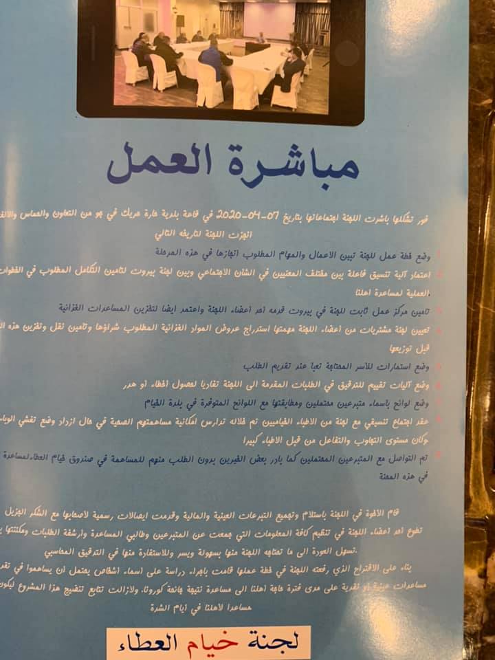 - أولاً: منذ انطلاقتها، تعمل كخليّة نحل جاهدة لإيصال المساعدة إلى كل محتاج مقيم خارج البلدة، ذلك بفضل نجاحها في كسب ثقة الخيّرين وأصحاب الأيادي البيضاء.