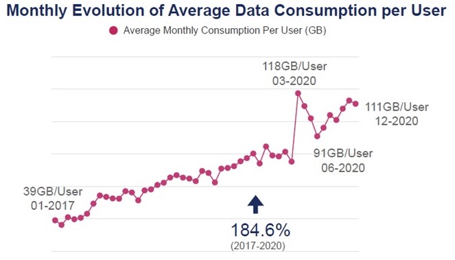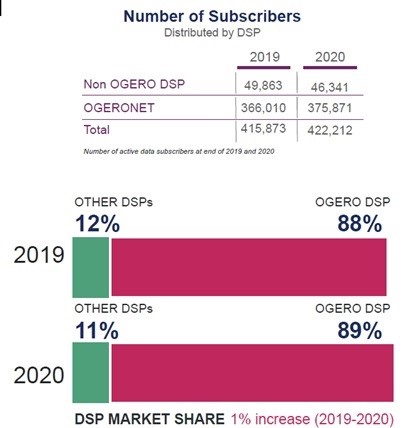 إشارة أيضاً إلى أن سعة الداتا التي توزعها أوجيرو تلكوم زادت في 2020، 32.8%. وهي زيادة تاريخية لاستعمال الشبكة أي بمعدل 1189GB مقارنة بـ895GB في 2019.