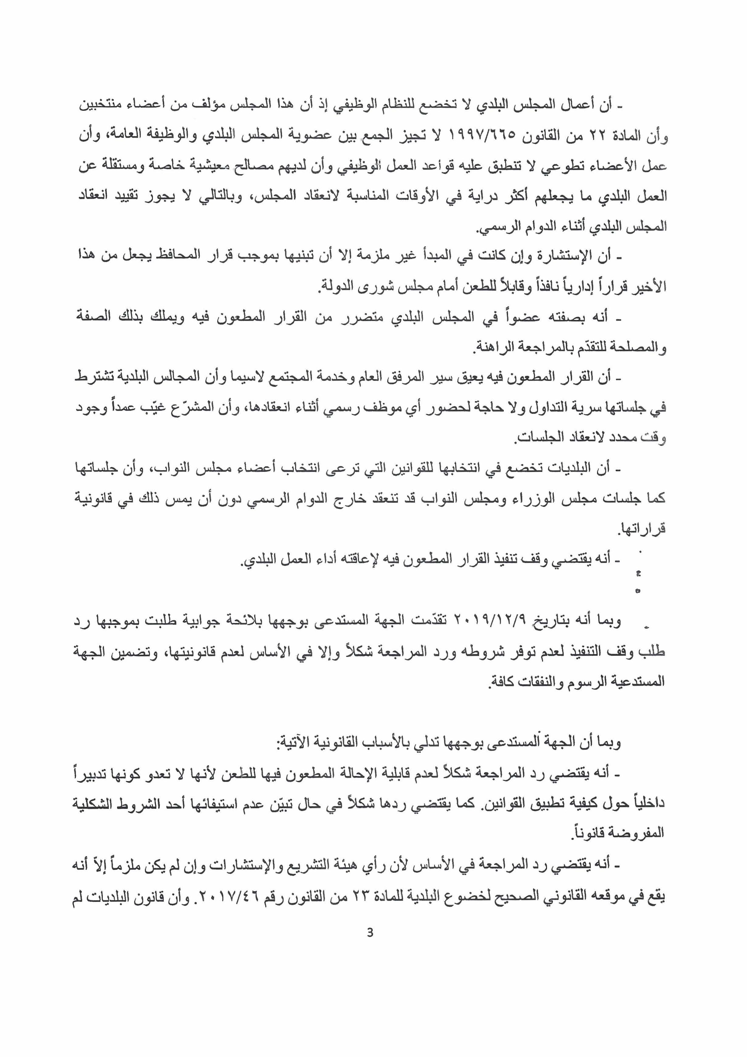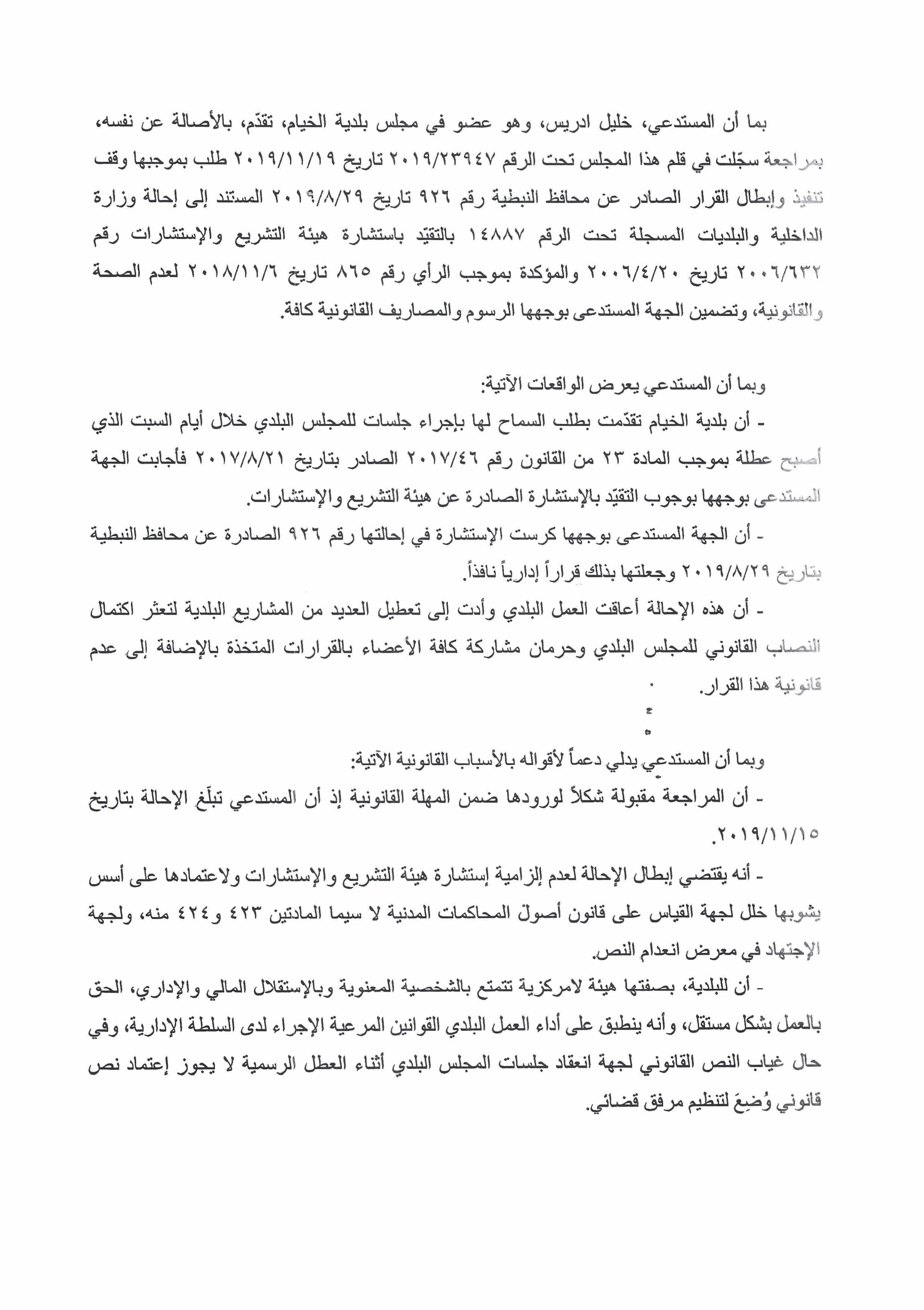 بتاريخ ٢٠٢١/٣/٣٠ صدر قرار قضائي عن جانب مجلس شورى الدولة، بناء على مراجعة مقدمة من قبلي، بتاريخ ٢٠١٩/١١/١٩ بصفتى عضو في مجلس بلدية الخيام، للطعن بقرار ايقاف عقد جلسات المجلس البلدي ايام السبت والعطل الرسمية والقاضي بإبطال هذا القرار بعد ان تم ايقاف تنفيذه سابقا بتاريخ ٢٠١٩/١٢/١٢ والسماح للبلديات كافة بممارسة مهامها في كل الاوقات والظروف.