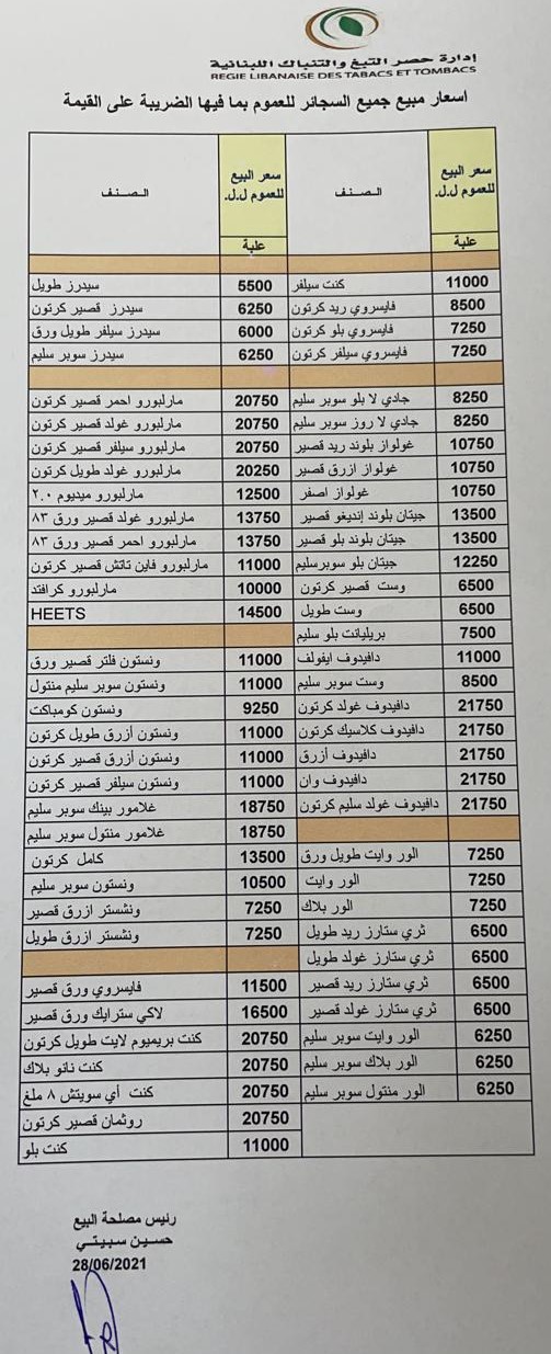 يُذكر أن إدارة حصر التبغ والتنباك اللبنانية "الريجي"، تنتج نحو 35 صنفاً من السجائر، مثل "كنت" و"غولواز" و"جيتان"، وغيرها من الأصناف وتفوق حالياً أسعار علبة المارلبورو والكنت والدافيدوف الـ20000 ليرة، حسب التسعيرة الرسمية. أما في الأسواق فتصل إلى 25000 ليرة. وتتفاوت بين تاجر وآخر، وحسب حاجة الزبون على غرار السوق السوداء للدولار والبنزين والدواء والمواد الغذائية وغيرها.
