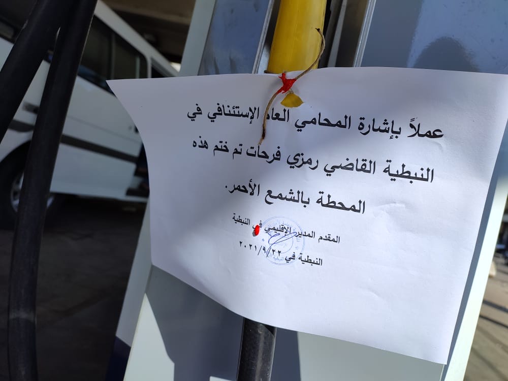 أقفلت دورية من مخفر درك النبطية ظهر اليوم، محطة في محلة مرج زبدين وختمتها بالشمع الاحمر، بناء على إشارة النائب العام الاستئنافي في النبطية القاضي رمزي فرحات اثر الاشكالات المتكررة التي تحصل أثناء بيع مادة البنزين للمواطنين وهي المرة الثانية التي يتم تشميعها خلال أقل من شهر.