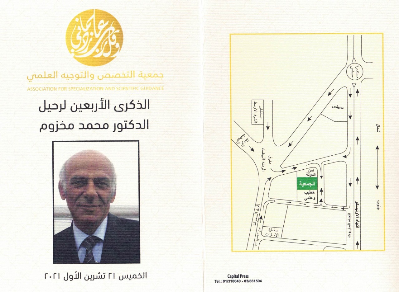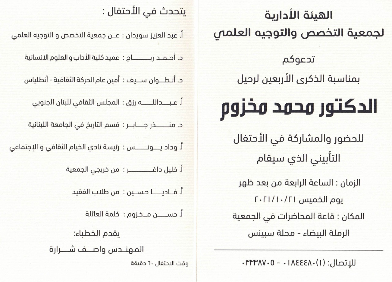 بهذه المناسبة يقام احتفال تأبيني عند الرابعة من بعد ظهر ذللك اليوم في قاعة المحاضرات في جمعية التخصص والتوجيه العلمي الكائنة في بيروت، الرملة البيضاء - محلة سبينس