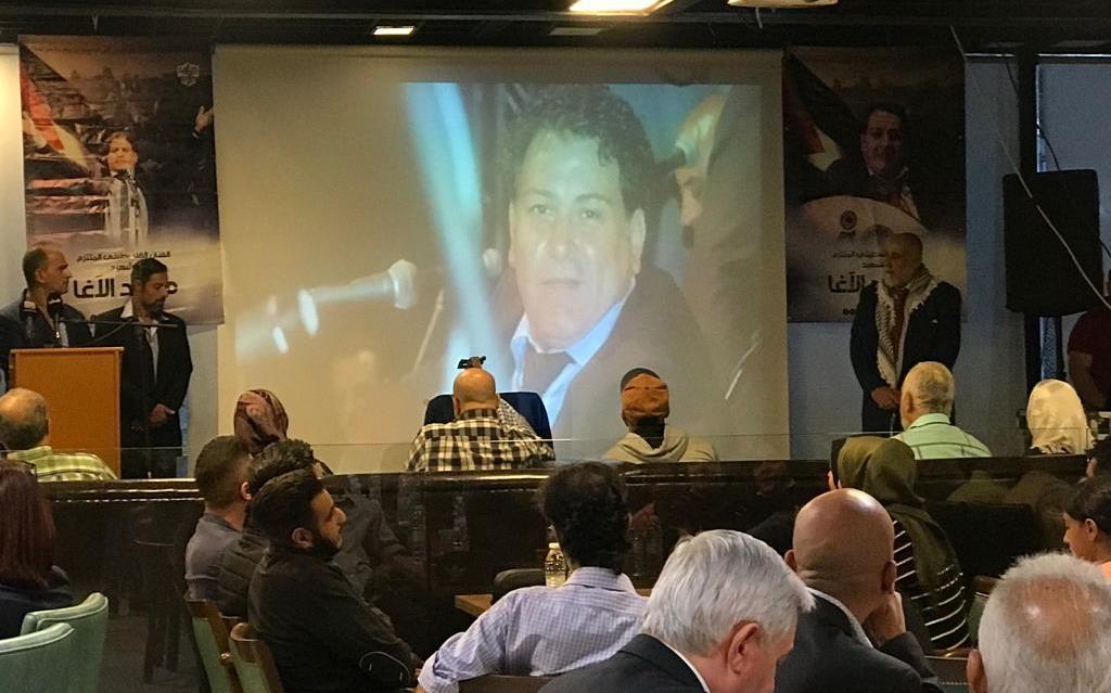 الدكتور طلال أبوجاموس رحّب بالحضور ومستذكراً الفنان الراحل بكلمات نابعة من القلب، ثم ألقى كلمة سفارة دولة فلسطين الأستاذ خالد عبادي الذي حمل تحيات سعادة السفير أشرف دبور والمستشار الأول ماهر مشيعل، متحدثاً عن محمد آغا الذي كان محباً لفنّه وحاملاً رسالة وطنية عبر نشر الفن والتراث الفلسطيني، ودائماً كانت بوصلته فلسطين، وختم بالتحية إلى روح الراحل.