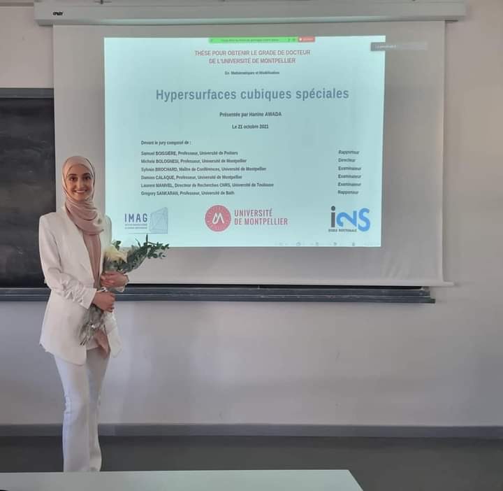 نالت الطالبة حنين محمد عواضة (من بلدة الشرقية ) شهادة الدكتوراه من جامعة مونبلييه الفرنسية في الرياضيات (الهندسة الجبرية) عن أطروحتها بعنوان :cubiques special hypersurface ونالت تقدير امتياز من اللجنة المشرفة على المناقشة.