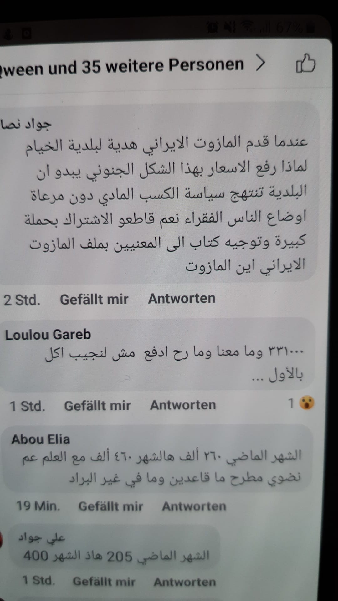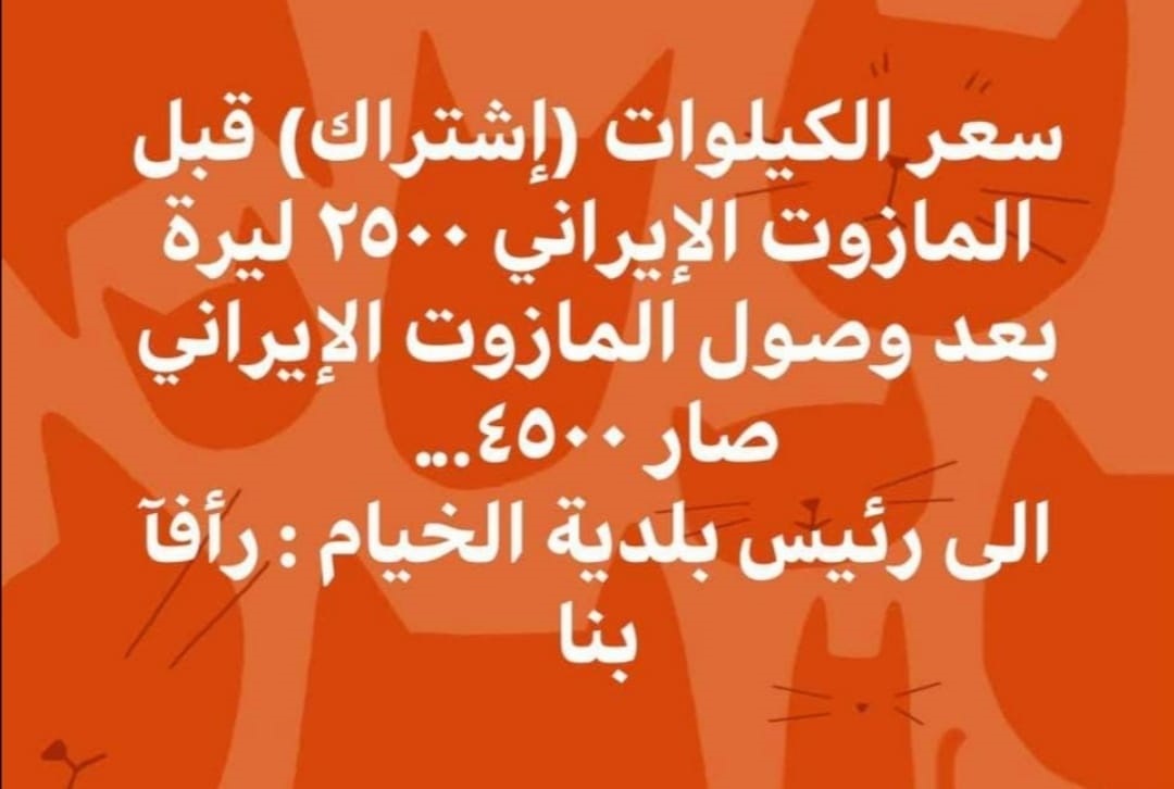 المواطنون تفاءلوا خيراً بعد وصول المازوت الايراني. وكان من الواجب الأخذ بذلك وتخفيض قيمة الكيلوواط ساعة، لكن القيمة تضاعفت هذا الشهر دون أي مبرر أو منطق ولا يدري أحد السبب ولا شفافية.. والأمور فلتانة إذ أن رئيس البلدية يدير المشروع وهو من يراقب نفسه.