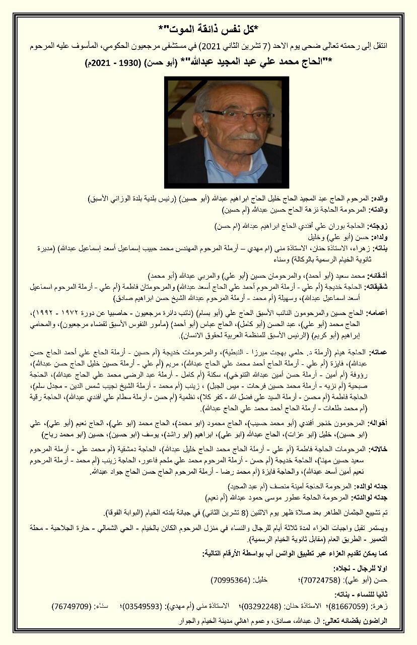 شييع أهالي الخيام وثلة من الانسباء من قرى الجوار بعد ظهر اليوم الاثنين (٨ تشرين الثاني ٢٠٢١) المرحوم "الحاج محمد علي عبدالمجيد عبدالله" (أبو حسن) (١٩٣٠-٢٠٢١) وذلك في القسم المستحدث جديداً في جبانة البلدة.