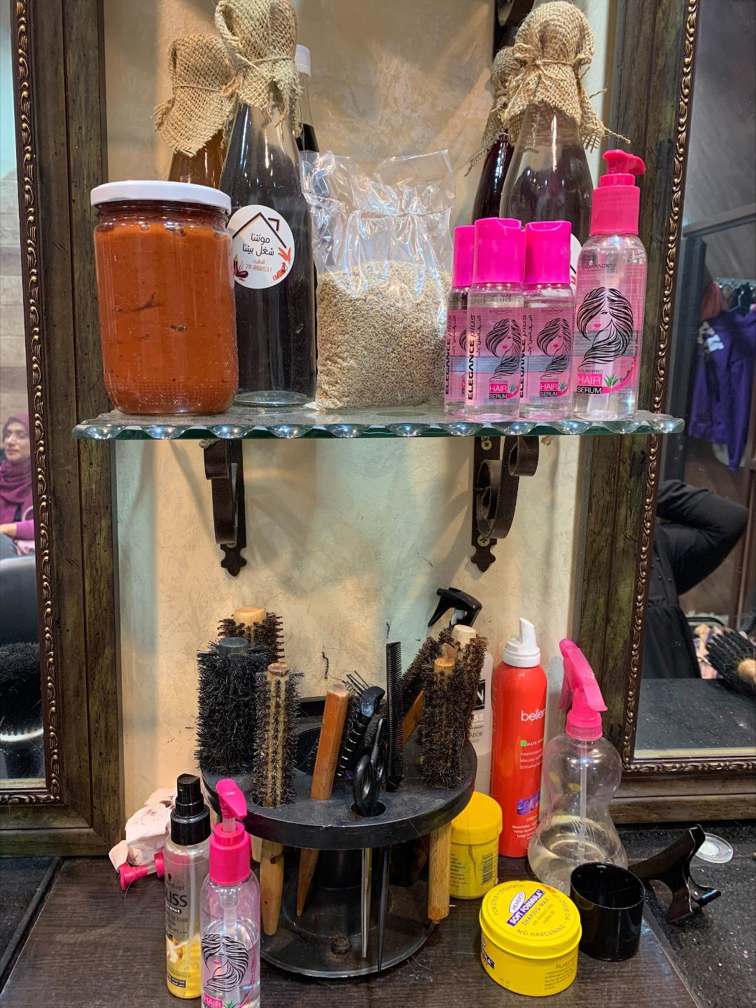 لكن نظرة سريعة في أرجاء الصالون الصغير، الخفيف الإضاءة لتقليص الأصفار في قيمة فاتورة اشتراك المولد الكهربائي، كفيلة بشرح كفاح منى في هذه الظروف المعيشيّة. على رفوف زجاجيّة عتيقة تصطف معدات التجميل. وعلى رفوف أخرى مقابلة بعض أصناف المونة المنزليّة، لبيعها الى زبونات الصالون، دفعاً للحاجة وتحصيلاً لأرباح قليلة في مواجهة الغلاء.