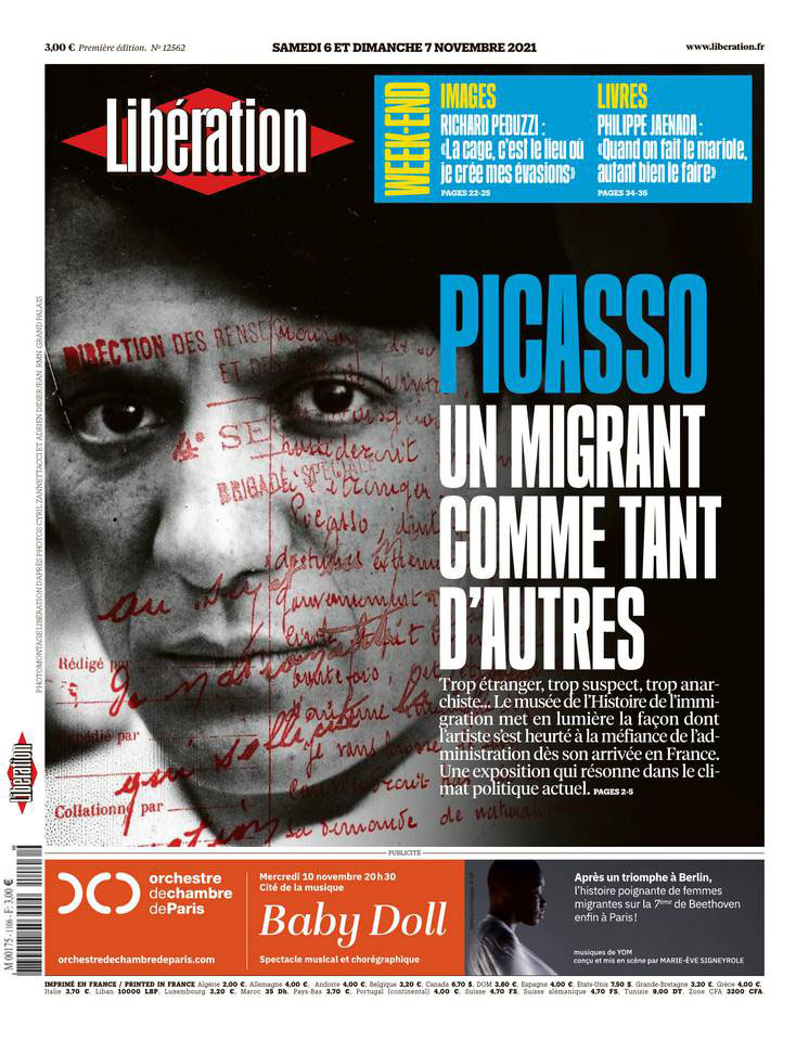صدرت صحيفة «ليبراسيون» بتاريخ الخامس من هذا الشهر (تشرين الثاني) 2021 بعنوان: «بيكاسو غريب كآخرين» Picasso un étranger comme les autres (إرتأينا كلمة غريب بدلاً من أجنبيّ ومهاجر). وعنوان ثانٍ: «خلف نجاح بيكاسو، عدم استقرار الغربة». (يبدأ المعرض في 4 تشرين الثاني 2021 وينتهي في 13 شباط 2022). إذاً، هو تحقيق حول الهويّة الفرنسيّة وبيكاسو.