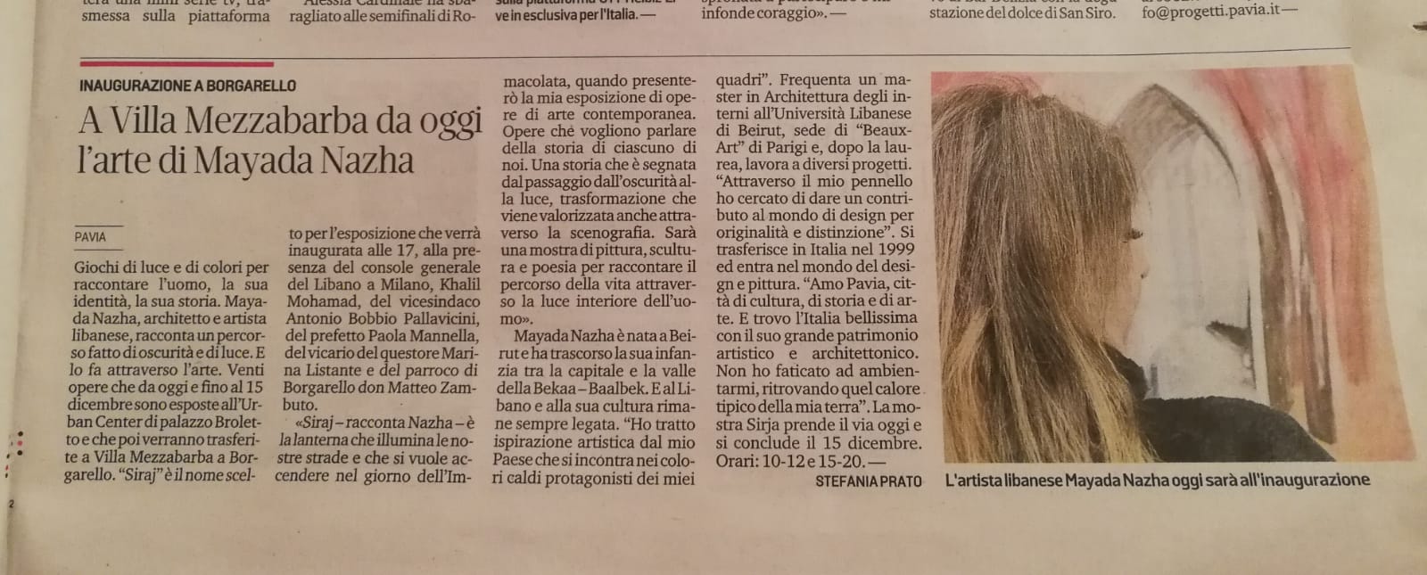 افتتحت التشكيلية والمهندسة اللبنانية «ميادة نزها» معرضها الفردي بعنوان «سراج» في مدينة بافيا الإيطالية برعاية القنصلية العامة اللبنانية في ميلانو وحضور سعادة القنصل الدكتور خليل محمد ورعاية الجمعية الثقافية اللبنانية في مدينة بافيا المتمثلة برئيسها البروفيسور حسين جلوس، ورعاية بلدية بورغادرو الممثلة برئيسها الدكتور نيكولا لامبرتي،وحضور ابرشية سان مرتينو فيسكوفو الممثلة برعيتها الاب دوم ماتيو زامبوتو.