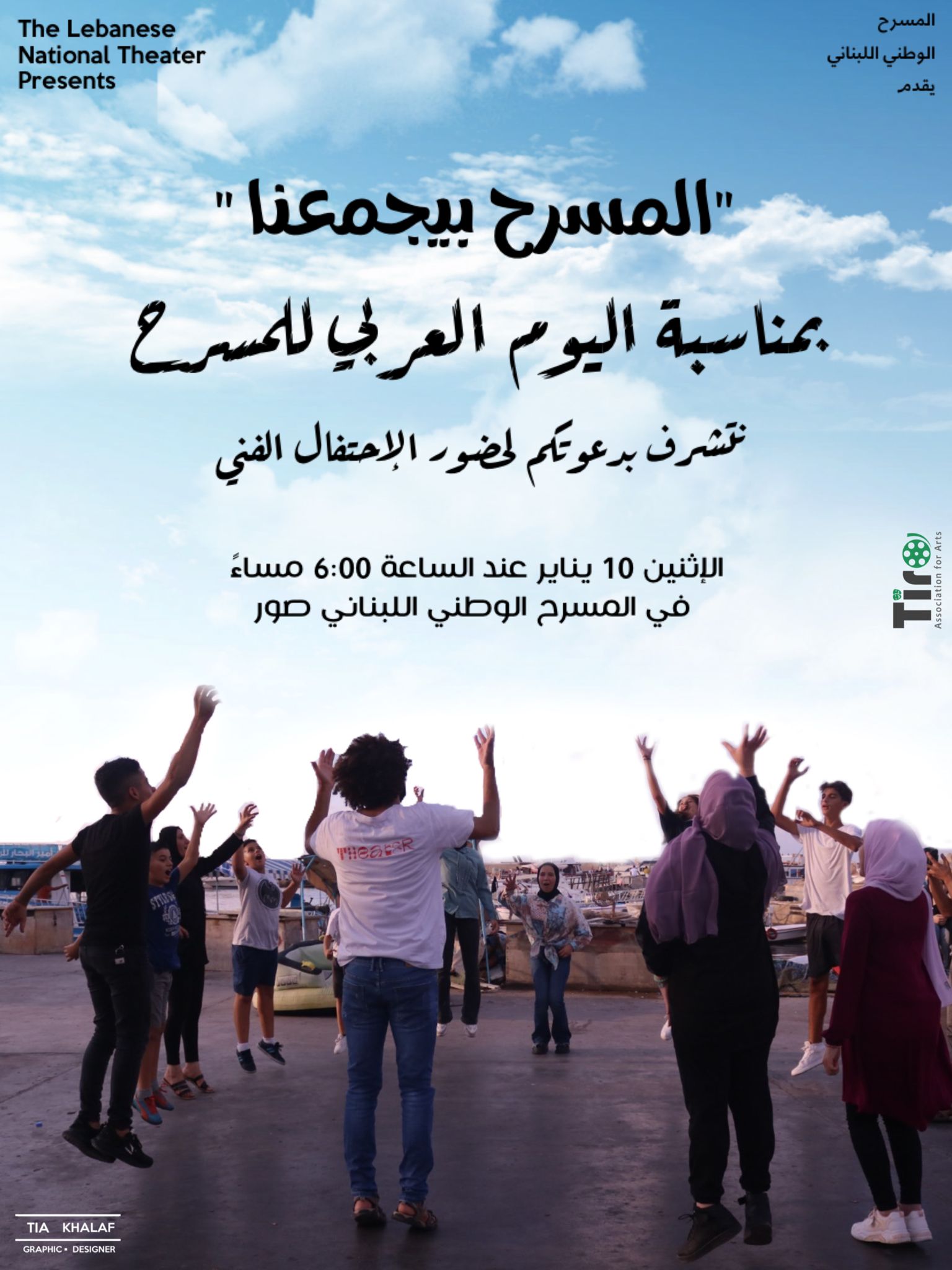 أعلنت "جمعية تيرو للفنون" و"مسرح إسطنبولي" بمناسبة "اليوم العربي للمسرح" وبالتزامن مع الذكرى السنوية الرابعة على تأسيس "المسرح الوطني اللبناني المجاني" في مدينة صور، عن إقامة إحتفال فني يتضمن عروضاً مسرحية وسينمائية وموسيقية عبر الإنترنت وبمشاركة المسرحيين العرب من خلال كلمات مصورة من وحي المناسبة سيتم بثها ضمن الإحتفال الذي سيقام في المسرح الوطني اللبناني وذلك يوم الأثنين في 10 يناير 2022 عند السادسة مساءً في توقيت بيروت .