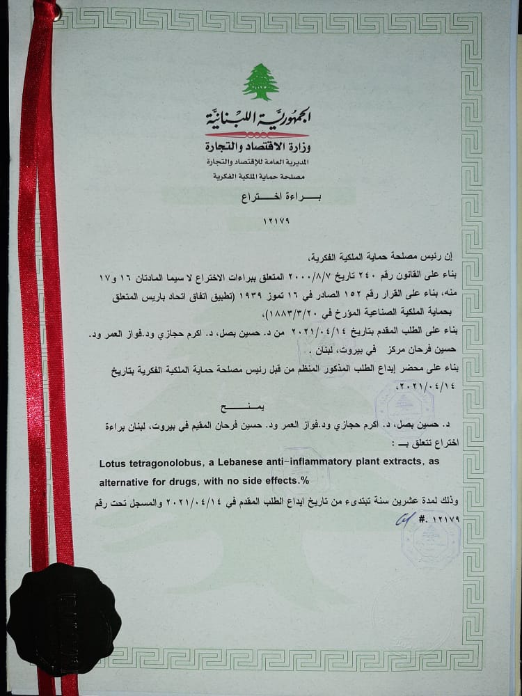 وتتعلق البراءة، المُسجّلة لدى مصلحة حماية الملكية الفكرية في الوزارة بتاريخ 14 نيسان 2021، باستخراج مادة من نبتة اللوتس - تتراغونولوبوس بطريقتين مختلفتين أكدت فعاليتها كمضاد للالتهابات بنسبة فاقت الـ ٩٧ في المئة باستخدام طريقتي الـ(PCR) والـ (Western blot) النبتة المعروفة شعبيًّا باسم "أصابع أم زينب" يمكن أن تكون بديلًا طبيعيًّا لأي من الأدوية الكيميائية المضادة للالتهابات التي قد تُحدث أحيانًا مشاكل في القلب أو سكتات دماغية.