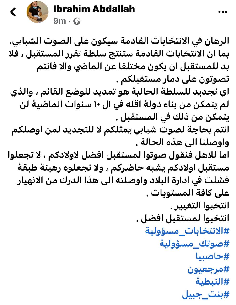 الناشط ابراهيم محمود عبدالله، المرشح عن المقعد الشيعي في دائرة مرجعيون - حاصبيا