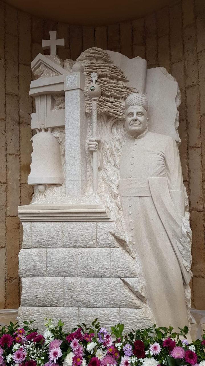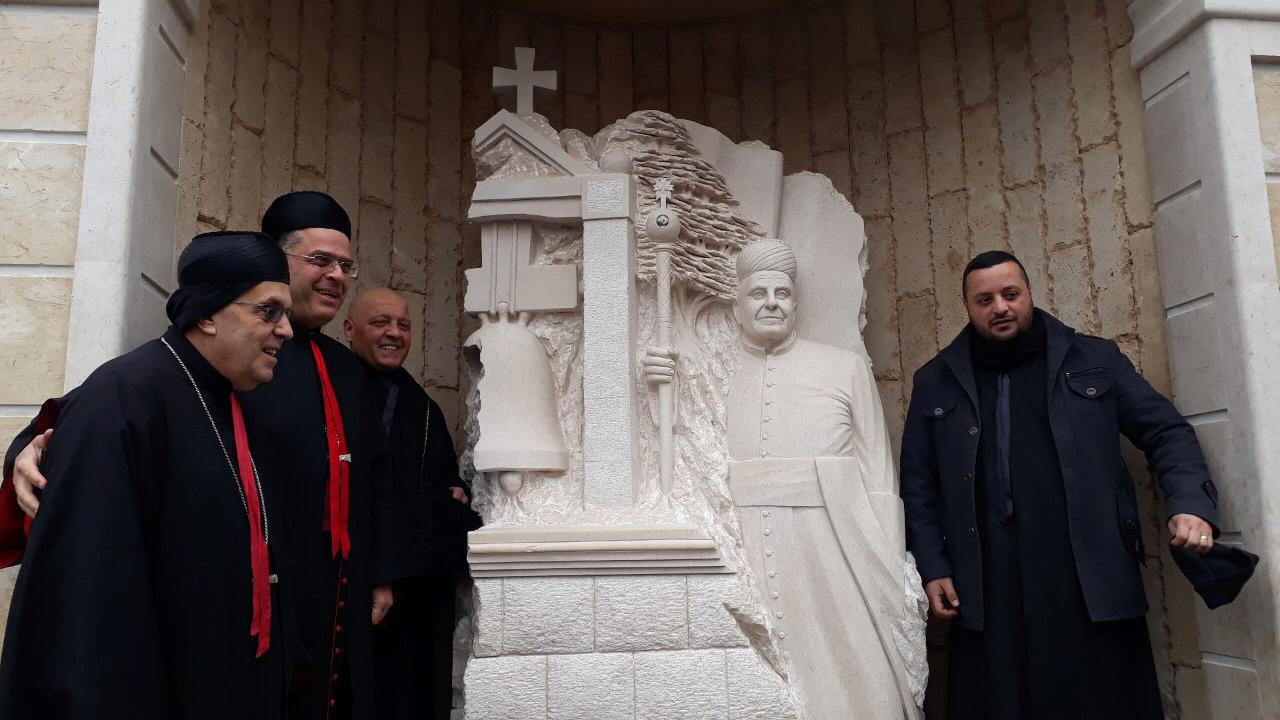 قَليلٌ وَنُشاهِدُ المَنْحوتَةَ الجِدارِيَّةَ التَّذْكارِيَّةَ بِعُنوانِ: "الصدّيقُ كالنخلِ يُزهِر وَمِثْلَ أَرْزِ لُبنانَ يَنْمي" التي سَيَقوم سِيادةُ رَئيسِ أَساقِفَتِنا بِإزاحةِ الستارةِ عَنْها، نُؤَكِّدُ أَنَّها لَيْسَتْ سِوى شاهِدٌ عَلى مَحَبَّتِكَ، أَيُّها المونسينيورُ الجليل، لِبَلْدَتِنا وَأَهْلِها وَكَنيسَتِها؛ لِذلِكَ حَمَلَتْ في قِوامِها قِبَّةُ جَرَسِ القليعة الذي طالَما قَرَعْتَهُ وَعَمِلْتَ عَلى تَحْسينِه بِاسْتِمرار