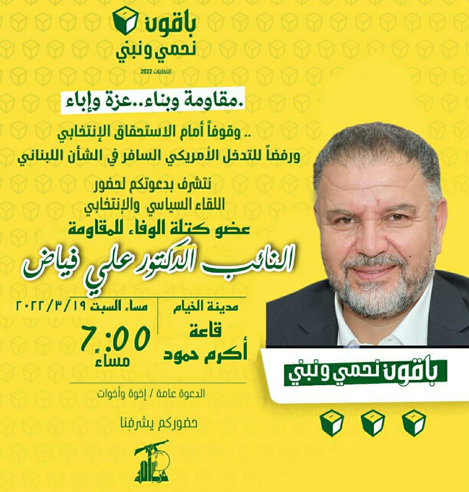 تحت عنوان "وقوفاً أمام الاستحقاق الانتخابي ومنعاً للتدخل الأمريكي السافر في الشأن اللبناني"، يُقيم النائب الدكتور علي فياض لقاءً سياسياً وانتخابياً في بلدة الخيام.
