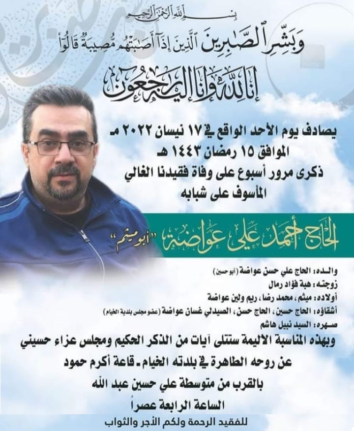 كما يقام ذكرى اسبوع على وفاته عن روحه الطاهرة الساعة الرابعة عصر يوم الأحد الواقع فيه ١٧ نيسان ٢٠٢٢ في بلدته الخيام في قاعة الحاج أكرم حمود بالقرب من متوسطة علي حسين عبدالله الرسمية.