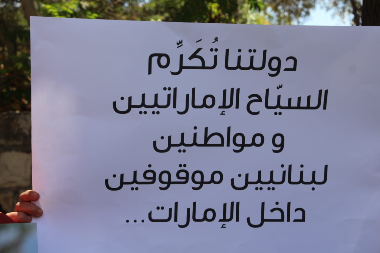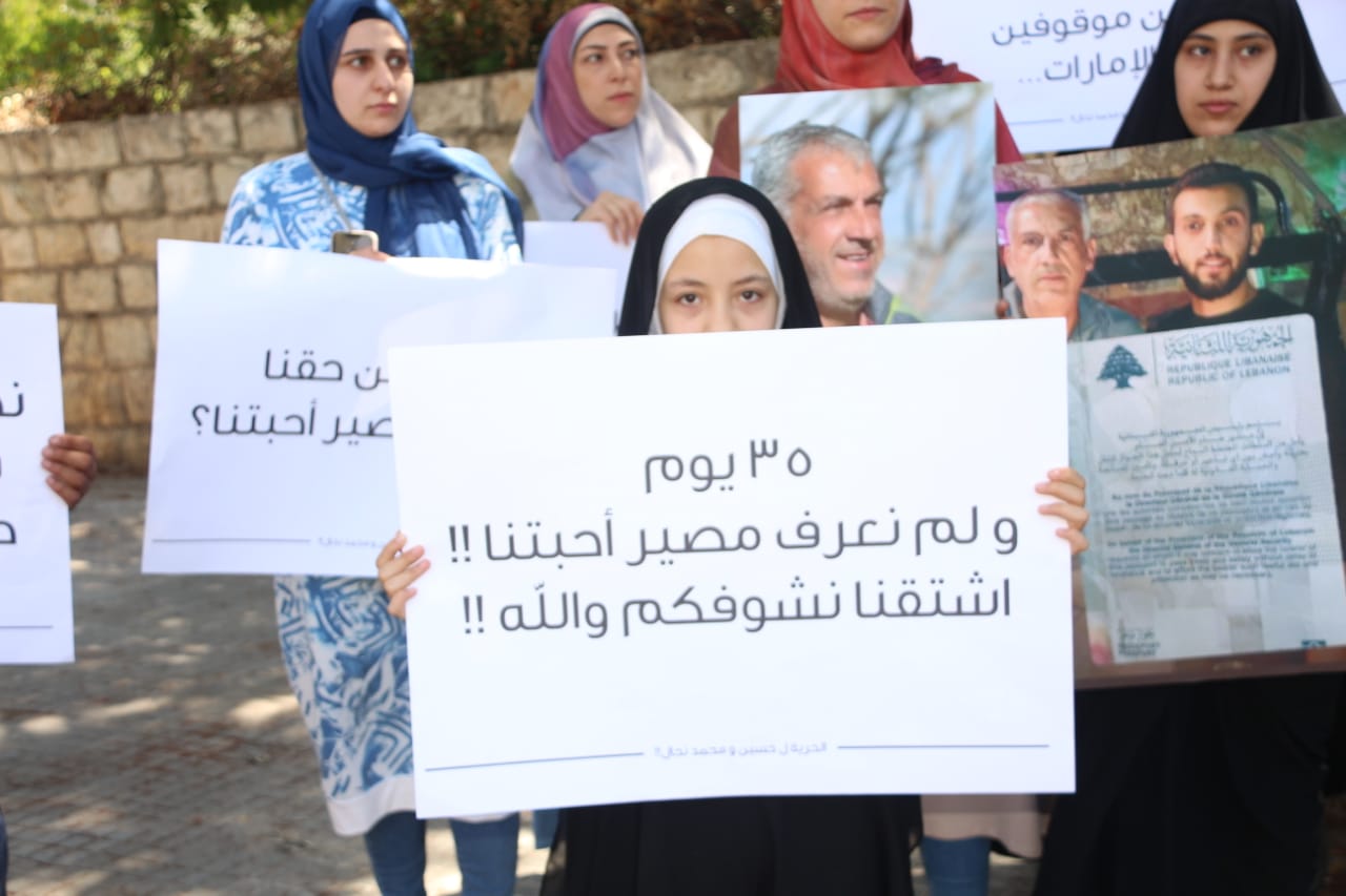ورفع المحتحون لافتتا كتب على بعضها "35 يوما ولا نعرف مصير احبتنا ، اشتقنا نشوفكم والله" ، و" اخبرونا كيف حالكم خلف قضبان السجون الحرية لحسين ومحمد نحال" ، و" دولتنا تكرم السياح الاماراتيين ومواطنين لبنانيين موقوفين في الاماارت"، و" سمو الشيخ زايد بن محمد ال نهيان : نطالب بالافراج عن الموقوفين حسين ومحمد نحال"، و" لا للتوقيف الطائفي والمذهبي ، ألسنا مواطنون لبنانييون".