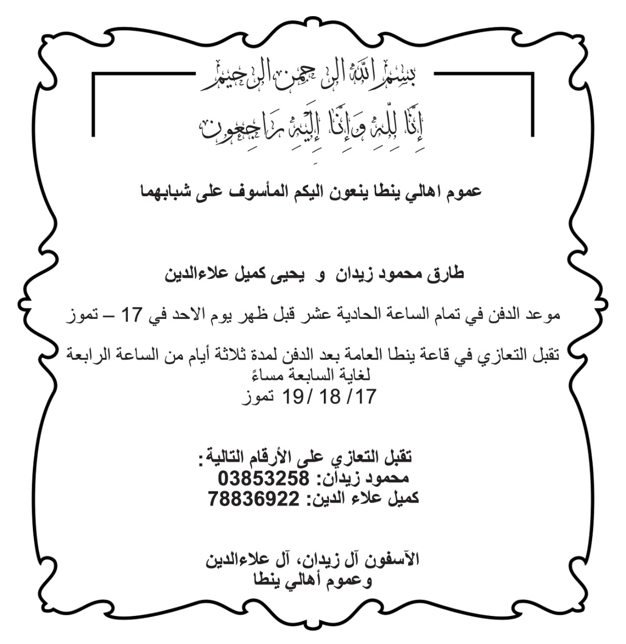 إدارة موقع حرمون، إذ ترفع الصوت، بوجه القتلة، مع أهلنا في ينطا، وفي القرى المجاورة، المستعدة لتقف وقفة رجل واحد، ضد التسيّب الأمني ومافيات القتل والغدر، تحذّر من الخفة والتقصير بكشف الجناة وعدم القدرة على تقديمهم للمحاكمة العادلة، تحت أقواس المحاكم، تتقدّم من الغاليين محمود زيدان وأسرته، وكميل علاء الدين وأسرته، ومن أهالي ينطا الغالية المعطائين كافة في الوطن والمهاجر بالمواساة، داعية الله العلي لروحيهما بالرحمة ولقلوب أحبائهما بالسلوان والسكينة والرضا.. المجد للحياة. البقاء للعطاء النبيل.