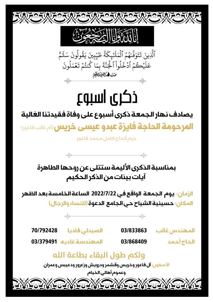 يصادف نهار الجمعة، الواقع فيه 22 تموز 2022، ذكرى مرور أسبوع على وفاة المرحومة الحاجة فايزة عبدو عيسى خريس (أم غالب فاعور)