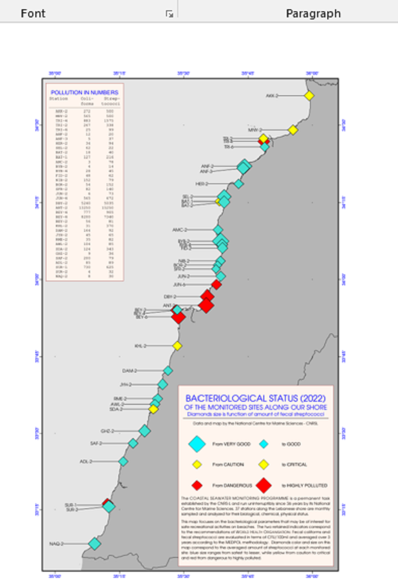 نتائج علمية مشجعة جداً للحالة البيئية للشاطئ اللبناني في زمن الانهيار: 65 في المئة من المواقع البحرية صالحة للسباحة وتحديداً 24 موقعاً من أصل 37 جيدة إلى جيدة جداً موزعة على امتداد الشاطئ اللبناني من الشمال إلى الجنوب.