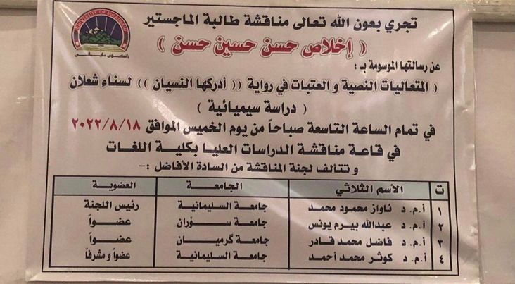السّليمانيّة/ إقليم كردستان العراق/ العراق: ناقشت الباحثة الكرديّة إخلاص حسن حسين حسن رسالتها الماجستير بعنوان "المتعاليات النّصيّة والعتبات في رواية أدركها النّسيان لسناء الشعلان: دراسة سيميائيّة" في قسم اللّغة العربيّة وآدابها في كليّة اللّغات في جامعة السّليمانيّة في إقليم كردستان العراق استكمالاً لمتطلبات الحصول على درجة الماجستير في فرع اللّغة العربيّة.