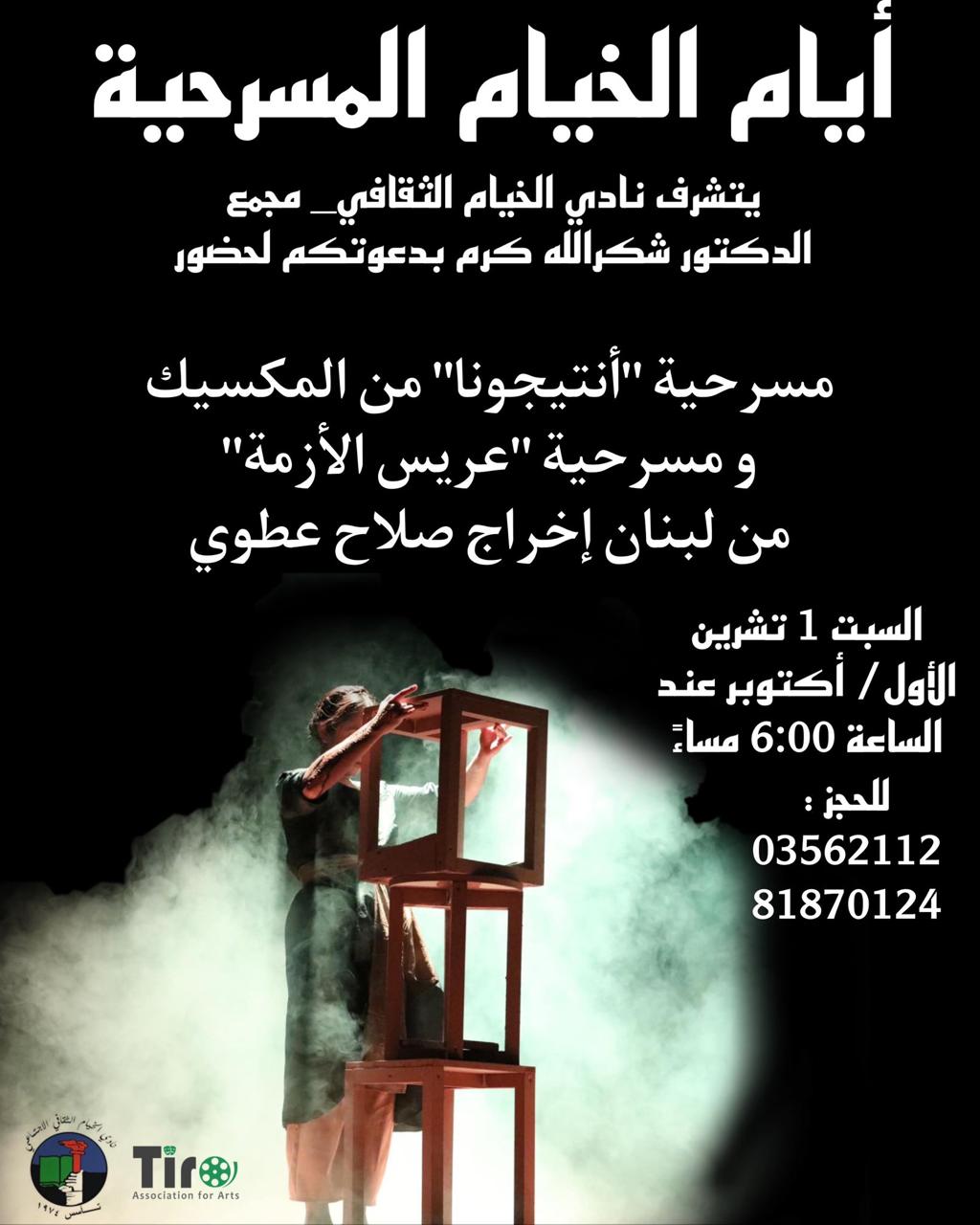 يتشرف نادي الخيام الثقافي الإجتماعي، مجمع د.الشهيد شكرالله كرم، بالتعاون مع جمعية تيرو للفنون والفنان قاسم اسطمبولي، بالدعوة لحضور مسرحيتين من "أيام الخيام المسرحية"