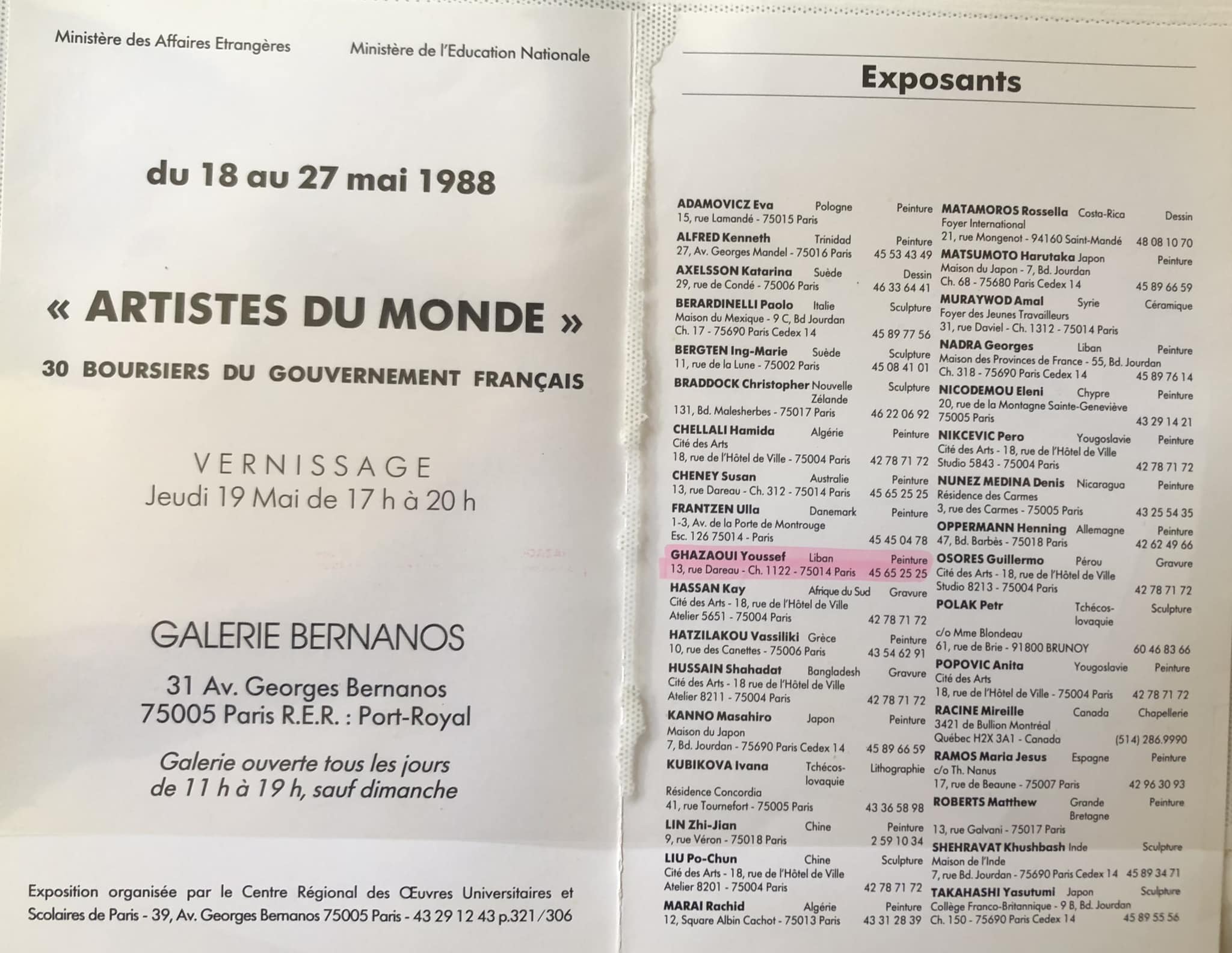 دعوة لمعرض مشترك لفنانين من العالم 1988، ممنوحين من الدولة الفرنسيّة في غاليري برنانوس Bernanos الباريسيّة، برعاية وزارتي الخارجيّة والتربية الفرنسيّتين؛ معرض دوليّ يحمل اتجاهات فنيّة مختلفة وغنيّة بتجاربها، وكان للبنان حضور فيه من خلال أعمالنا..