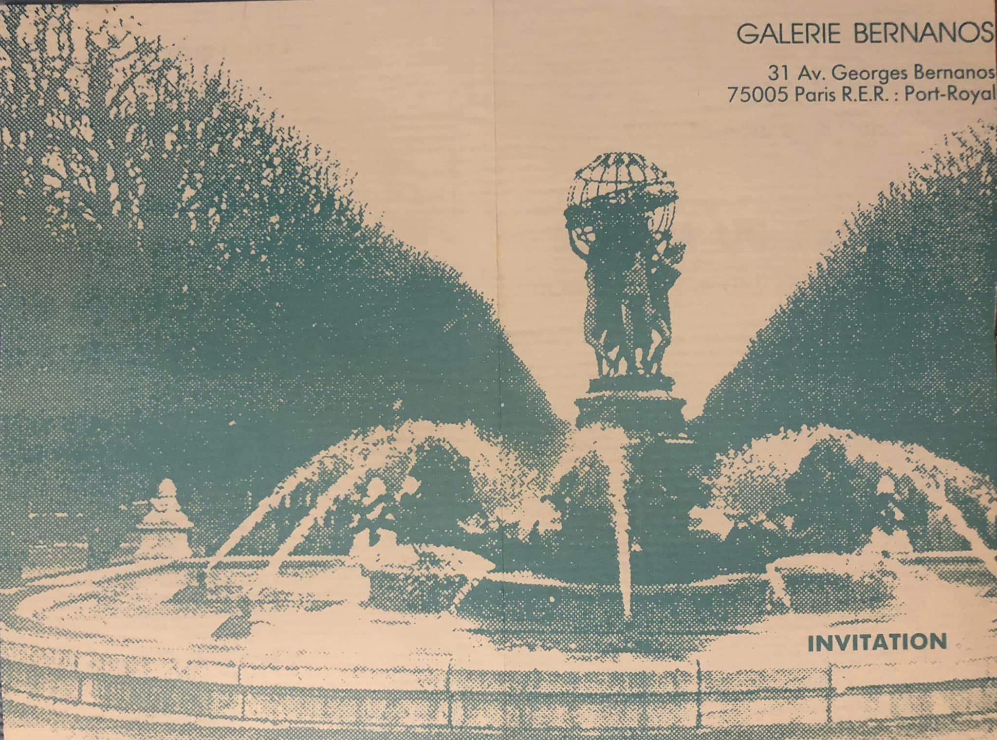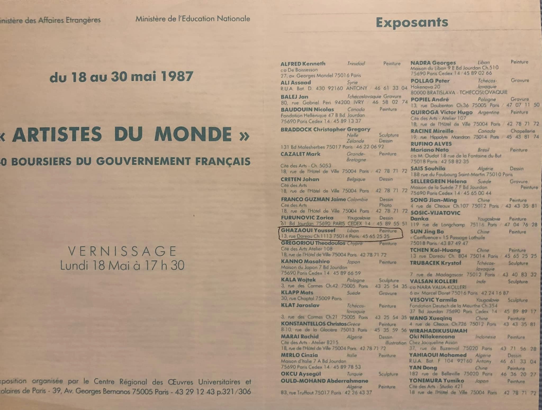 معرض جماعيّ آخر 1987، في غاليري برنانوس Bernanos الباريسيّ، برعاية وزاتيّ الخارجيّة والتربيّة الفرنسيّتين، لفنانين ممنوحين من الدولة الفرنسية من الجنسيّات التالية: ترينيداد- سوريا- تشكوسلوفاكيا- كندا- نيل- بريطانيا- بلجيكا- كولومبيا- يوغوسلافيا- لبنان- اليابان- بولونيا- اليونان- الجزائر- إيطاليا- تركيا- البرازيل- السويد- الصين- الهند وأندونيسيا..