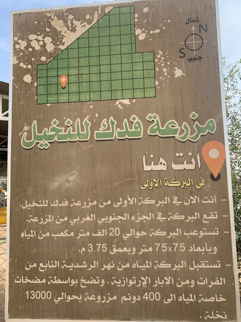 + مزرعة فدك للنخيل وتقع في منطقة الرزازة الواقعة الى الجهة الغربية من كربلاء على مساحة 5000 دونم وتم اطلاق المشروع عام 2015 زرع حتى الان 30000 شجرة نخيل من اجود الانواع والمخطط الاستيعابي مقرر ان يصل الى 60 الف شجرة نخيل وتضم معمل للتوضيب واخر لتأصيل الشتول وبيعها ، كما يوجد فيها 5 بحيرات مائية بحجم 20 الف متر مكعب مجهزة بمنظومة متكاملة ومتميزة للري عبر التنقيط ، ويشكل فريق العمل المزرعة من 100 مهندس وعامل وسائق ويشرف عليها المهندس فائز ابو المعالي.