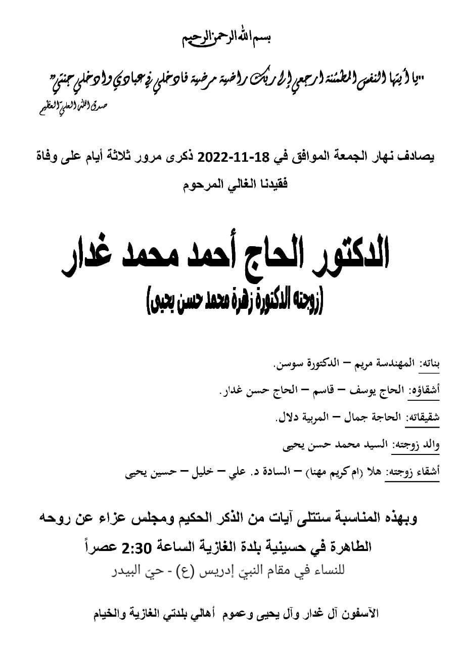 يصادف نهار الجمعة الواقع فيه 18 تشرين الثاني 2022 ذكرى مرور ثلاثة أيام على وفاة صهر بلدتنا الخيام الحاج الدكتور أحمد محمد غدّار.