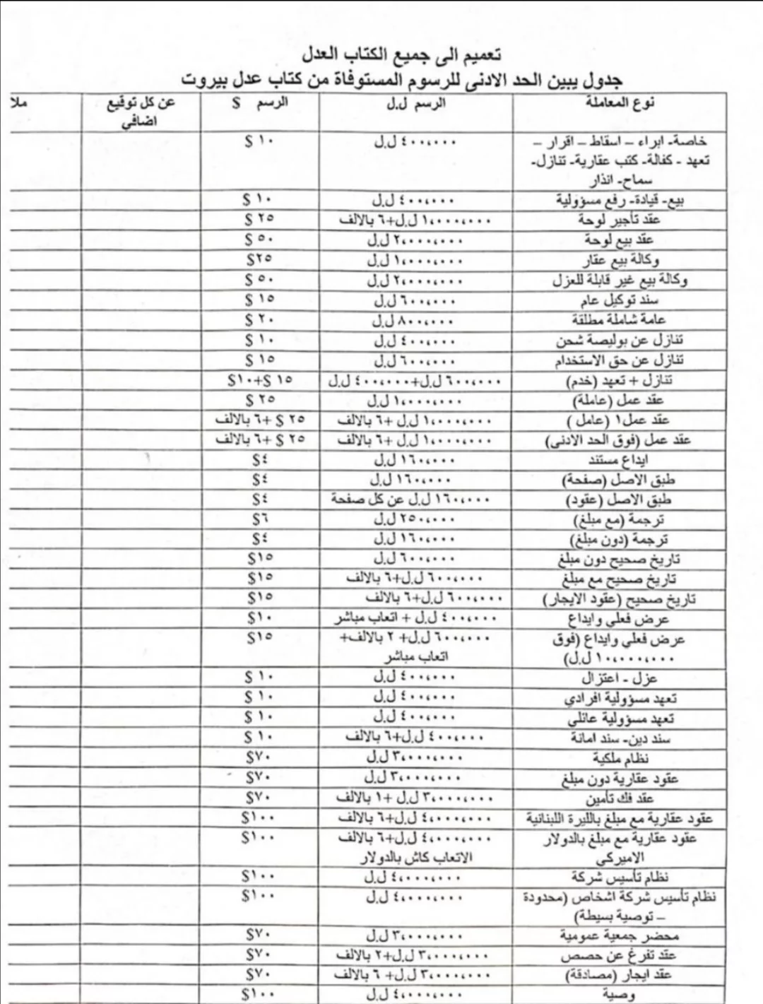 عدم صدور الجدول عن أي جهة رسمية، لا يعني عدم تعديل الرسوم بالمطلق لتتلاءم مع تغيُّر الأسعار. فعلى سبيل المثال لا الحصر "عدّلت وزارة المالية طريقة احتساب رسم الطابع على العقود. فإذا كان عقد بيع الشقة مثلاً، بالدولار، أصبح رسم الطابع 4 بالألف يُحتَسَب بالدولار على سعر صيرفة، فيما كان حتى تاريخ 15 تشرين الثاني الماضي، يُحتَسَب على سعر 1507 ليرة. كما أن أتعاب كتّاب العدل المتمثّلة بـ1 بالألف من قيمة بعض العقود، يتقاضونها بالدولار، بحسب عملة العقد".