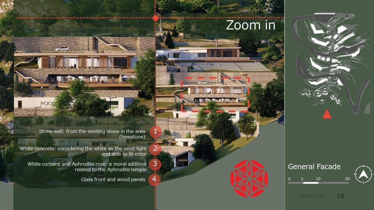 اما بالنسبة للعناصر الجمالية المضافة الى المشروع، فاختيرت معظم العناصر من التي تحمل شيء من الرسائل المعنوية: كزهرة افروديت التي شكلت وحدة الاسقف الخارجية، و الوشاحات البيضاء التي كانت تستخدم في الطقوس الدينية للمعابد القديمة في تلك المنطقة، بالاضافة الى شجر التين و زهور ادونيس التي تتواجد قي المكان عينه.