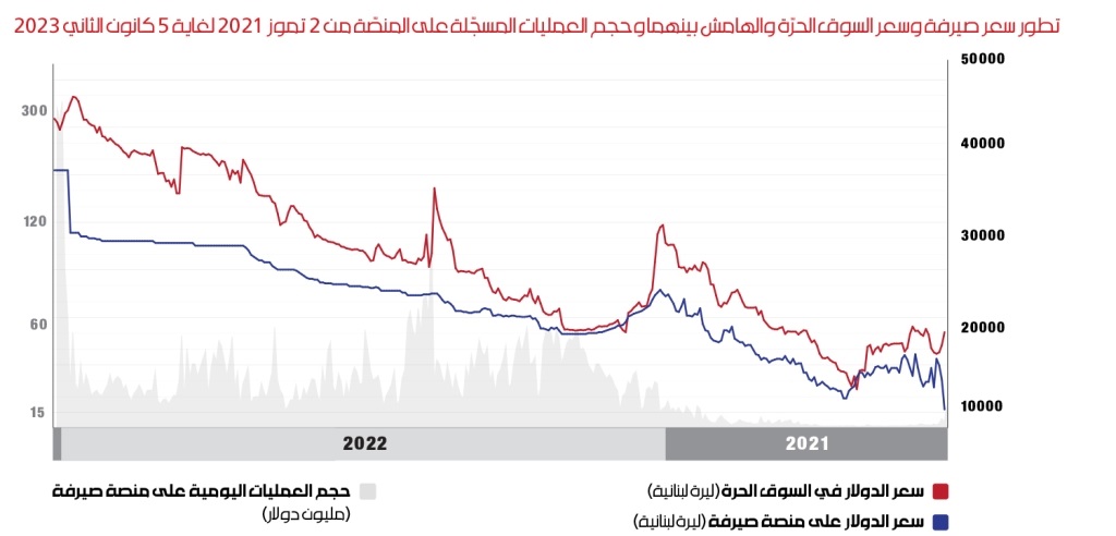 العمليات التي باتت تُعرف باسم «صيرفة» هي العمليات التي تنفّذ طبقاً للتعميم 161 الصادر في 16/12/2021. في هذا التاريخ قرّر مصرف لبنان التدخّل في سوق القطع وأتاح للمصارف استقبال إيداعات الزبائن بالليرة وشراء، لحساب الزبائن، دولارات بما يوازي قيمتها على سعر «صيرفة»، وعلى أساس كوتا وسقف محدّد لكل مصرف. في البداية لم يفلح الأمر في كبح سعر الصرف في السوق الحرّة، ولم تتكثّف العمليات على المنصّة لشراء الدولارات وبيع الليرات، فاندفع حاكم مصرف لبنان رياض سلامة نحو رئيس الحكومة نجيب ميقاتي وأصدر الأول بياناً بعد نقاشاتهما يقول فيه إنه سيبيع الدولارات بلا حدود. خلال عشرين يوماً قفز سعر الصرف في السوق نحو 4 آلاف ليرة ومثله قفز سعر «صيرفة»، إنما تضخّم حجم العمليات أكثر من 5 مرات في المتوسط ثم تراجع سعر الصرف في السوق الحرّة 4 آلاف ليرة. لاحقاً بدأ مصرف لبنان يقلّص وتيرة تدخله، إلى أن حدّد العمليات المتاحة لكل حساب مصرفي بقيمة 400 دولار شهرياً. وفي نهاية السنة الماضية قرّر أن يعيد الكرة وأن يفتح السقف مجدداً لبيع الدولارات بلا حدود، فسيطر فانخفض سعر الصرف لبضعة أيام وبلغ حجم العمليات على المنصّة 1.1 مليار دولار، فأعاد إغلاق السقوف وترك سعر الصرف يعود إلى مستوياته السابقة. في المرّة الأولى كان الهامش بين السعرين يتراوح بين 3 آلاف ليرة و11 ألف ليرة، وفي المرة الثانية انخفض من 14 ألف ليرة إلى 6500 ليرة.