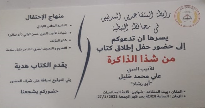 تقيم "رابطة المتقاعدين المدنيين في محافظة النبطية" حفل إطلاق كتاب "من شذا الذاكرة" للأديب المربي "علي محمد عبدو خليل" (أبو رشاد)، وذلك في قاعة محاضرات بيت المتقاعد – بلدة شوكين (قضاء النبطية) وذلك في الساعة (3:00) بعد ظهر يوم الجمعة (27 كانون الثاني 2023)، ويتخلل الحفل كلمة للأديب المربي "حسن كركي" (أبو صالح) ويعقبها كلمة مؤلف الكتاب، ومن ثم يتم توقيع نسخ من الكتاب للسادة الحضور كهدية من المؤلف.