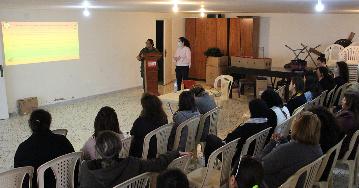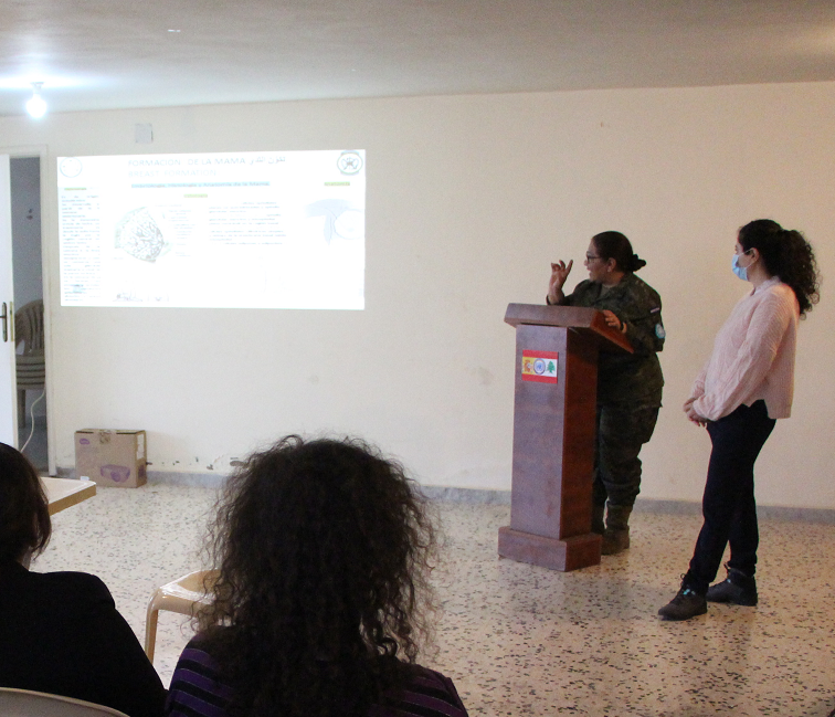 خلال المحاضرة الأولى، قام الفريق الطبي السلفادوري التابع للكتيبة الاسبانية بطرح موضوع أهمية الرضاعة الطبيعية لأكثر من 25 امرأة من جمعية المرأة اللبنانية "بيتي بيتك"، التي تنطم حفلات خيرية لصالح الأفراد الأكثر احتياجا في المنطقة.