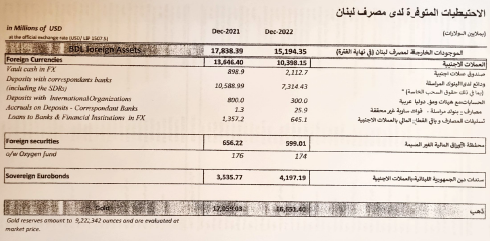 الميزانيّة السنويّة لمصرف لبنان، ويظهر التغيّر في قيمة بندي "صندوق عملات أجنبيّة" و"ودائع لدى البنوك المراسلة"