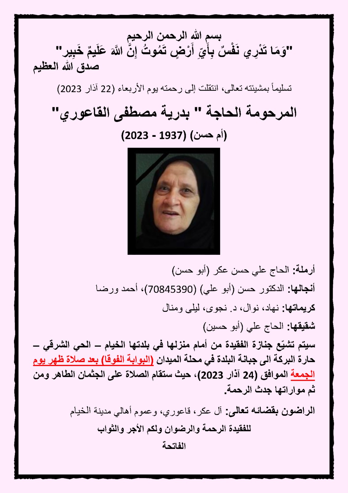 سيتم تشييع الجنازة من أمام منزلها الكائن في بلدتنا الخيام،الحي الشرقي – حارة البركة، الى جبانة البلدة في محلة الميدان (البوابة الفوقا) بعد صلاة ظهر اليوم الجمعة الموافق (24 آذار 2023).. حيث ستقام الصلاة على الجثمان الطاهر ومن ثم مواراتها جدث الرحمة.