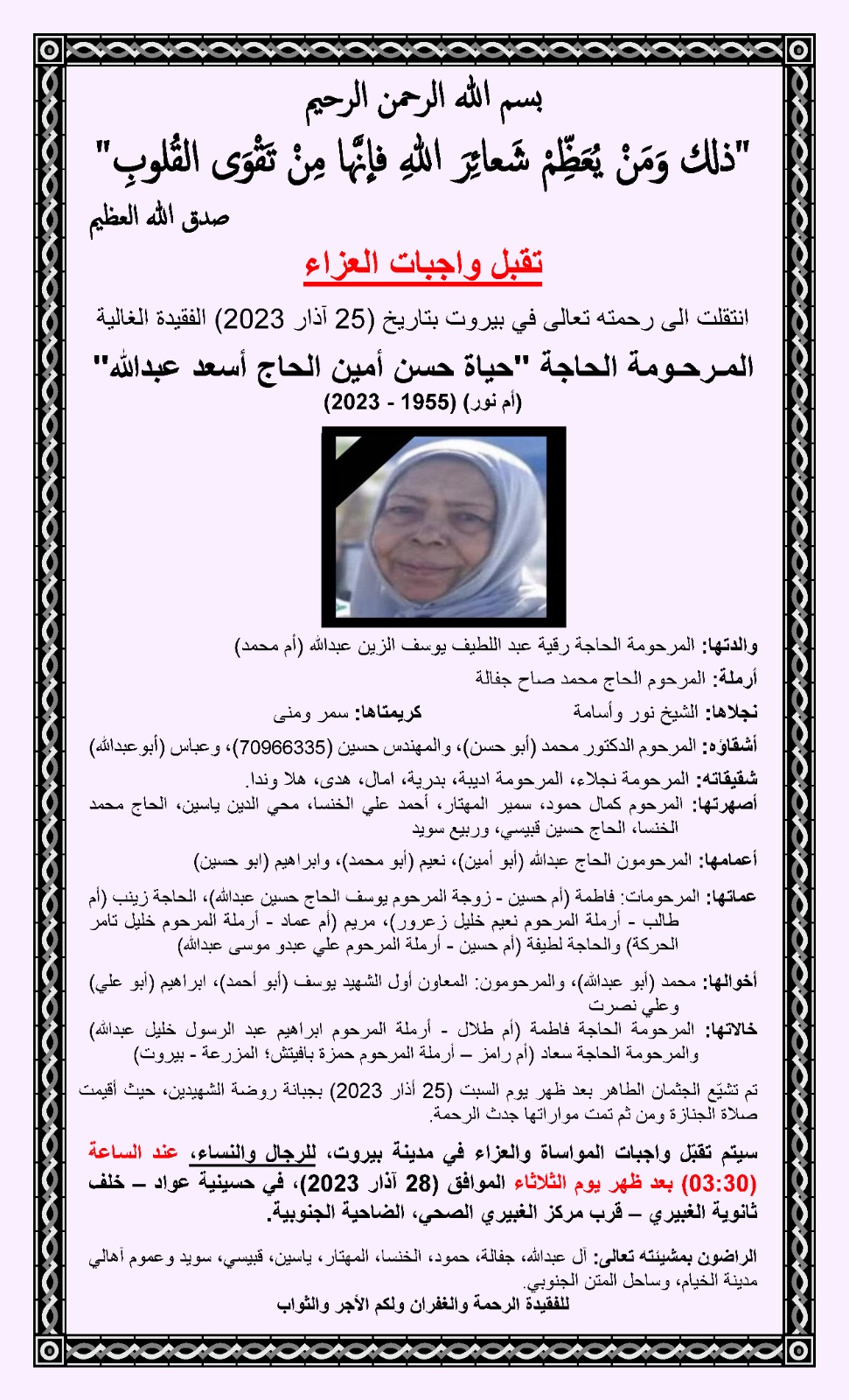 انتقلت الى رحمته تعالى في بيروت بتاريخ (25 آذار 2023) الفقيدة الغالية