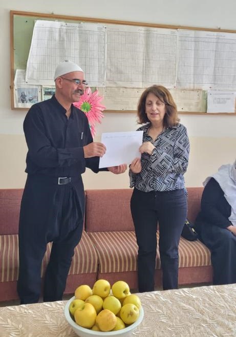 وسلمت شقيقة غسان السيدة الفاضلة ليلى قنتيس المبلغ إلى مدير المدرسة الشيخ سهيل علود حديفة بحضور رئيسة لجنة الأهل وأعضاء الهيئة الإدارية والكادر التعليمي في المدرسه.