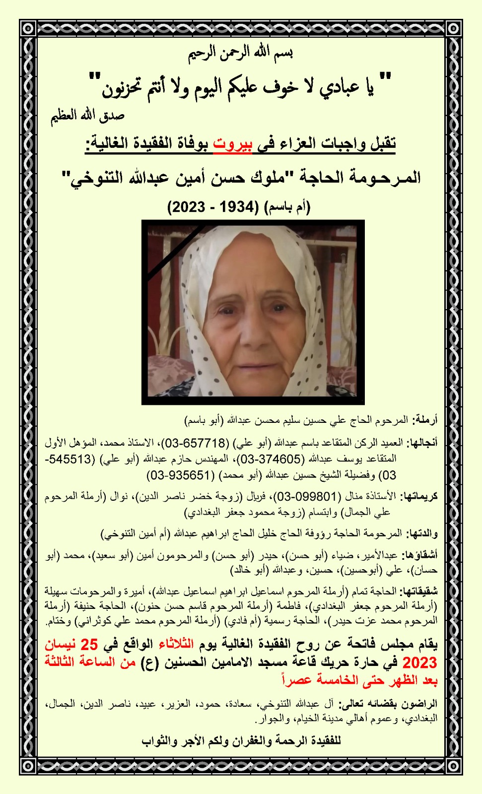يقام مجلس فاتحة عن روح الفقيدة الغالية يوم الثلاثاء الواقع في 25 نيسان 2023 في حارة حريك قاعة مسجد الامامين الحسنين (ع) من الساعة الثالثة بعد الظهر حتى الخامسة عصراً